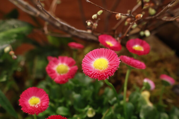 3月に入り、だんだんと暖かくなり、樹木も芽吹いてまいりました 坪庭のもみじも新芽が顔を出し、春のリキュウバイやヒュウガミズキの蕾が花咲くのが、今から楽しみです デージーやマラコイデスの明るい花も加わり、坪庭はすっかり春の雰囲気です ぜひ、春の訪れを感じに浜町店にお越しください メインの花・・・マラコイデス、デージー、リキュウバイ、ヒュウガミズキ